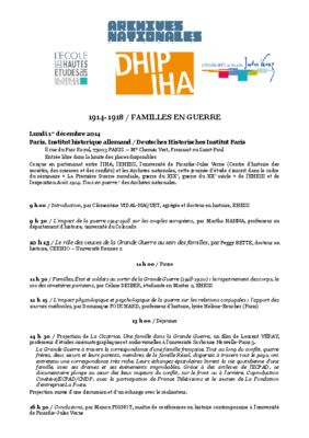 Studientag organisiert von den Archives nationales, dem DHIP, der EHESS und der Universität Picardie-Jules Verne im Rahmen des Forschungsseminars »La Première Guerre mondiale, guerre du XIXe, guerre du XXe siècle« und der Ausstellung »Août 1914. Tous en guerre !« in den Archives nationales.
