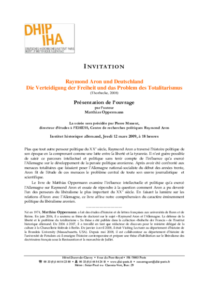 Vorstellung des Buches »Raymond Aron und Deutschland. Die Verteidigung der Freiheit und das Problem des Totalitarismus« von Matthias Oppermann durch den Autor, unter Leitung von Pierre Manent (Directeur d'études an der EHESS, Centre de recherches politiques Raymond Aron)