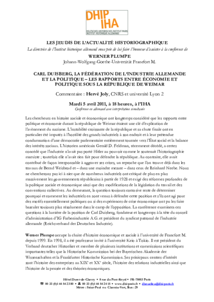 Carl Duisberg, la Fédération de l’industrie allemande et la politique – Les rapports entre économie et politique sous la République de Weimar