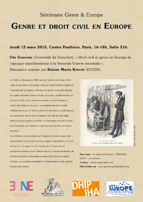 Vortrag von Ute Gerhard (Goethe-Universität Frankfurt) im Rahmen des Seminars »Genre & Europe« des LabEx EHNE, axe genre, in Zusammenarbeit mit dem DHIP (C. Wenkel) Kommentar: Rainer Maria Kiesow (EHESS).