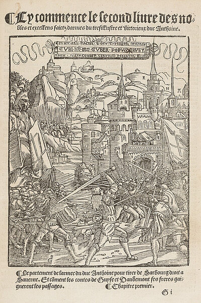 Bildnachweis: Illustration de la bataille à Saverne (1525). Nicole Volcyr de Sérouville, L’Histoire et recueil de la triumphante et glorieuse victoire obtenue contre les seduyctz et abusez Lutheriens mescreans du pays Daulsays et autres par tres hault et tres puissant prince et seigneur Anthoine, […] en deffendant la foy catholicque, notre mere l'Eglise et vraye noblesse. A l'utilite et prouffit de la chose publicque, Paris 1526, 37r.