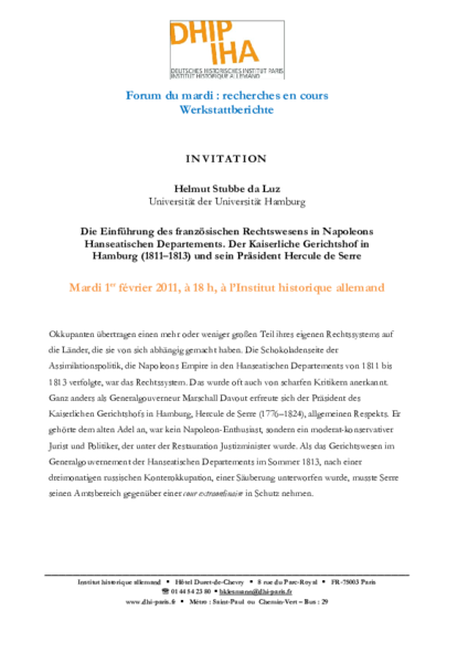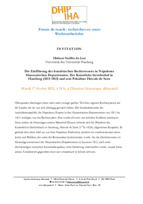 Helmut Stubbe da Luz (Universität der Bundeswehr, Hamburg), Die Einführung des französischen Rechtswesens in Napoleons Hanseatischen Departements. Der Kaiserliche Gerichtshofin Hamburg (1811-1813) und sein Präsident Hercule de Serre