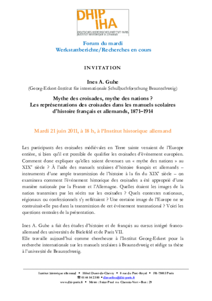 Ines Guhe (Georg-Eckert-Institut für internationale Schulbuchforschung Braunschweig), Mythe des croisades, mythe des nations ? Les représentations des croisades dans les manuels scolaires d'histoire français et allemands, 1871–1914