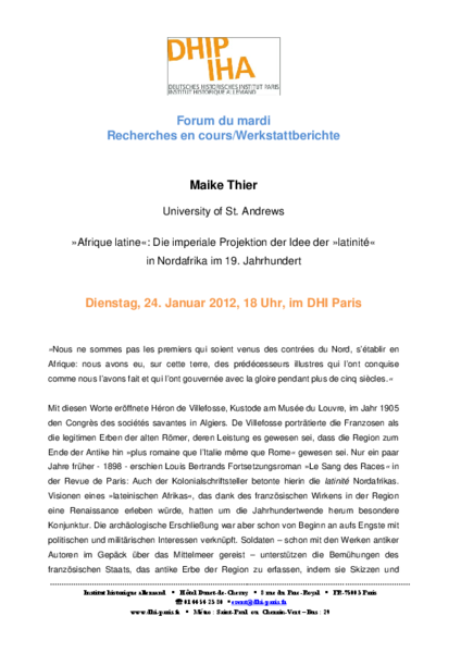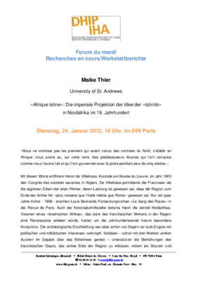 Maike Thier (Universität St. Andrews), »Afrique latine«: Die imperiale Projektion der Idee der »latinité« in Nordafrika im 19. Jahrhundert