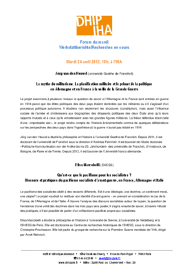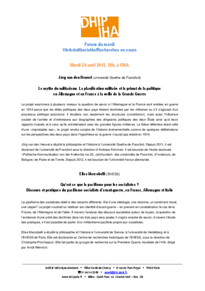 Jörg van den Heuvel (Goethe-Universität Frankfurt a. M.), Le mythe du militarisme. La planification militaire et le primat de la politique en Allemagne et en France à la veille de la Grande Guerre