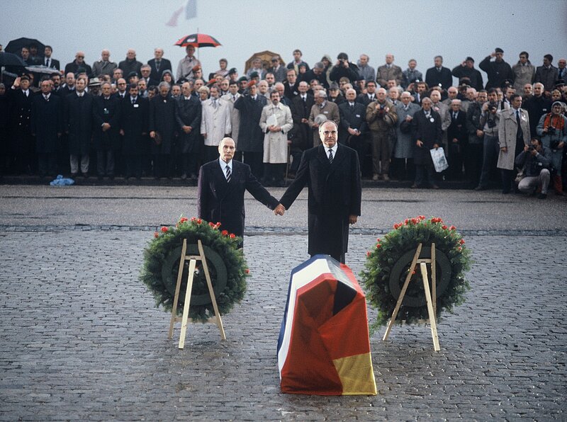 Bildnachweis: Handschlag zwischen François Mitterand und Helmut Kohl in Verdun, 22. September 1984, Bundesregierung, B 145 Bild-00012935, Fotograf: Richard Schulze-Vorberg