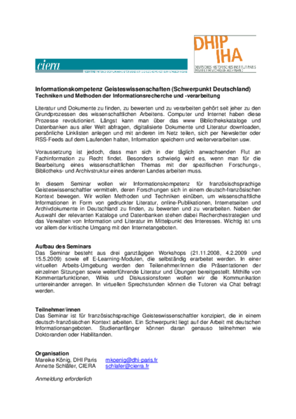 Teil 2 des Seminars in französischer Sprache, organisiert vom DHIP (Mareike König) und dem CIERA (Annette Schläfer)