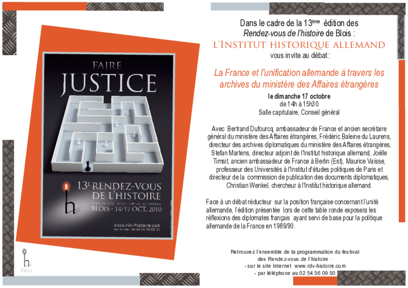 Table ronde mit Betrand Dufourcq, Joëlle Timsit und Maurice Vaïsse organisiert vom DHIP (S. Martens, Ch. Wenkel) in Zusammenarbeit mit der Direction des archives du ministère des Affaires étrangères (J. Mendelson) anlässlich des Publikationsprojektes La France et l'unification allemande à travers les archives du ministère des Affaires étrangères