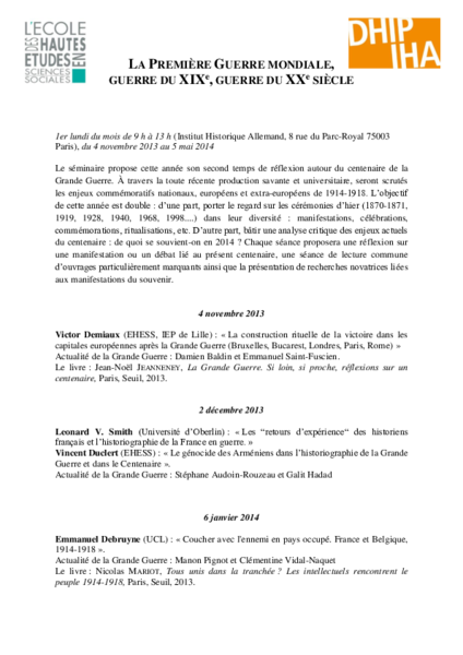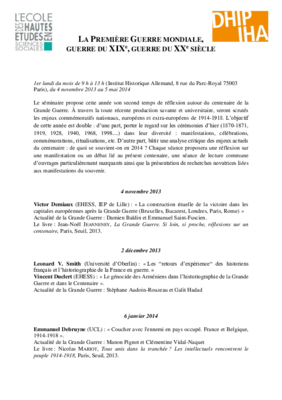 Monatliches Forschungsseminar organisiert von der EHESS (S. Audoin-Rouzeau, D. Baldin, V. Demiaux, G. Haddad, F. Heimburger, M. Pignot, E. Saint-Fuscien, C. Vidal-Naquet) in Zusammenarbeit mit dem DHIP (A. Weinrich).