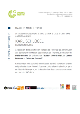 Vortrag von Karl Schlögel, Le Berlin russe, und anschließende Podiumsdiskussion mit Corine Defrance, Catherine Goussef und Ulrich Pfeil organisiert vom Goethe-Institut Paris, dem DHIP, der Universität Lorraine und dem LabEx EHNE in Zusammenarbeit mit der FMSH, dem DAAD sowie dem Centre d’études des mondes russe, caucasien et centre-européen (EHESS).