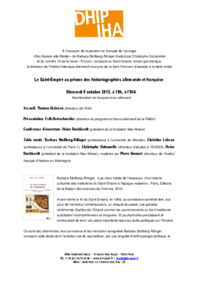 Podiumsdiskussion anlässlich der Publikation auf Französisch von Barbara Stollberg-Rilingers Buch »Des Kaisers alte Kleider« und der Nummer 14 von »Trivium« über das Alte Reich: Barbara Stollberg-Rilinger (Universität Münster), Christine Lebeau (Universität Paris 1), Christophe Duhamelle (EHESS) und Heinz Duchhardt (Präsident der Max Weber Stiftung) moderiert von Pierre Monnet (lnstitut français d’histoire en Allemagne).