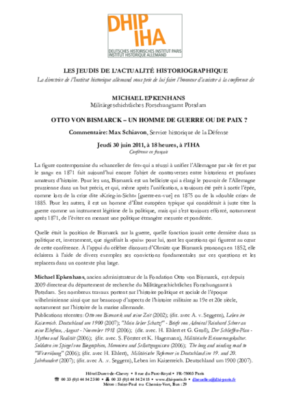 Vortrag von Michael Epkenhans (Militärgeschichtliches Forschungsamt), Otto von Bismarck – un homme de guerre ou de paix ? Kommentar: Max Schiavon, Service historique de la Défense Vortrag auf Französisch