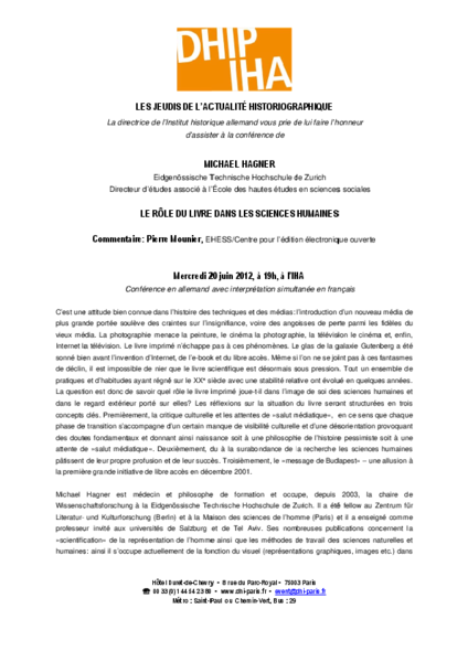 Michael Hagner (ETH Zürich), Le rôle du livre dans les sciences humaines Kommentar: Pierre Mounier, EHESS/CLEO Vortrag organisiert vom DHIP in Kooperation mit der EHESS