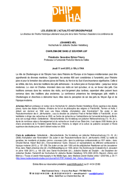 Charlemagne dans le souvenir juifVortrag von Johannes Heil (Universität Heidelberg), Kommentar: Geneviève Bührer-Thierry (Universität Paris-Est).
