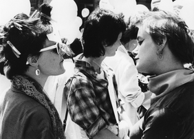 Zwei stark geschminkte Frauen, im Hintergrund weiße Luftballone, auf Maske der Aufdruck: Hetero Garanti (e) 4.8.81; evt. in der Romandie. © Schweizerisches Sozialarchiv