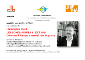 Vortrag von Christopher Clark anlässlich der Publikation von Christopher Clark, Les somnambules: été 1914. Comment l’Europe a marché vers la guerre, Paris 2013. Moderation: Arndt Weinrich (DHIP).
