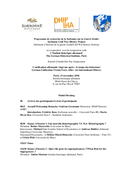 Kolloquium des Forschungsprogramms über den Kalten Krieg der Universitäten Paris I-Pantheon Sorbonne (M.-P. Rey) und Paris III-Sorbonne Nouvelle (F. Bozo) in Zusammenarbeit mit dem DHIP (Ch. Wenkel)