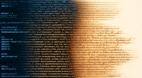 Bildnachweis: DALL-E, CC-0, Prompt: A hyperrealistic photograph showing on one side a handwritten text from the 17th or 18th century, and on the other side computer code representing the text.