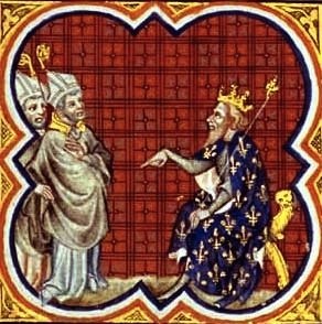 Grégoire de Tours et Salvius d’Albi devant Chilpéric Ier (Grandes Chroniques de France, Bibl. nat. de France, ms. franç. 2813, fol. 41v)