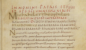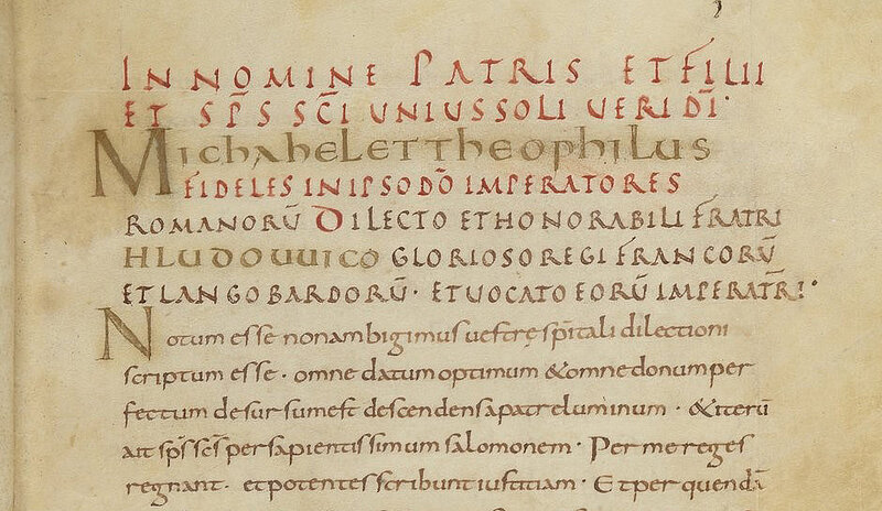 Bildnachweis: Brief vom 10. April 824 von den Kaisern Michael II. und Theophilos an Kaiser Ludwig den Frommen, Paris, BNF, lat. 1597A, fol. 5r.