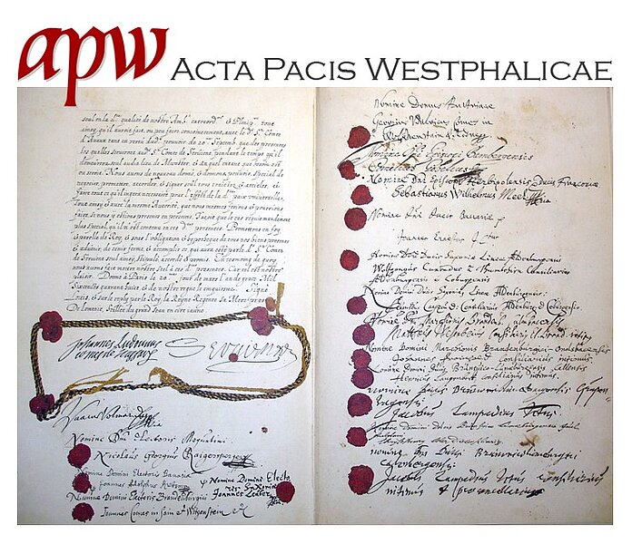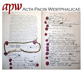 Bildnachweis: Instrumentum Pacis Monasteriense mit APW-Logo, in: Heinz Duchhardt, Franz-Josef Jakobi (Hg.), Der Westfälische Frieden. Das Münsterische Exemplar des Vertrages zwischen Kaiser/Reich und Frankreich vom 24. Oktober 1648, Teil I: Faksimile, Wiesbaden 1996. Foto und Collage: Zentrum für Historische Friedensforschung Bonn, 2021.