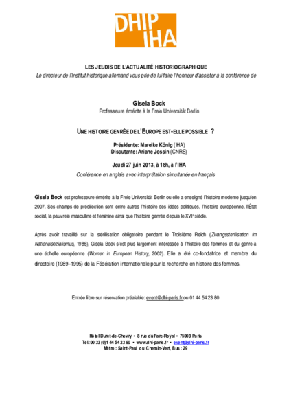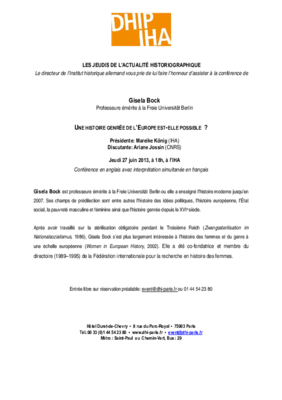 Vortrag von Gisela Bock, Freie Universität Berlin, im Rahmen der Tagung »Pour une histoire genrée de l’Europe« sowie der Vortragsreihe »Les jeudis de l’actualité historiographique«.