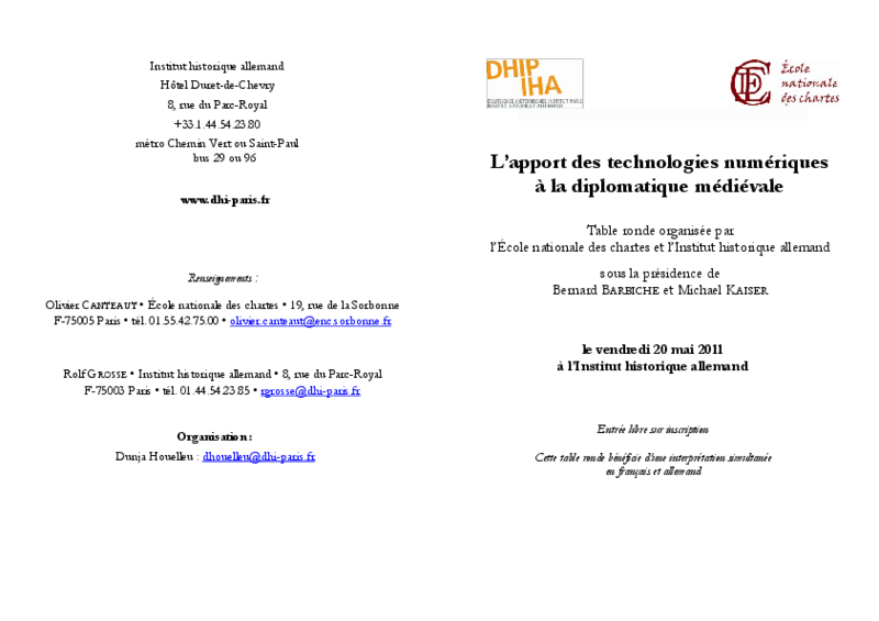 Table ronde organisiert von der École nationale des chartes und dem DHIP (R. Große) im Rahmen des vierten Tag der Geisteswissenschaften und der siebten Rencontre der Gallia Pontificia