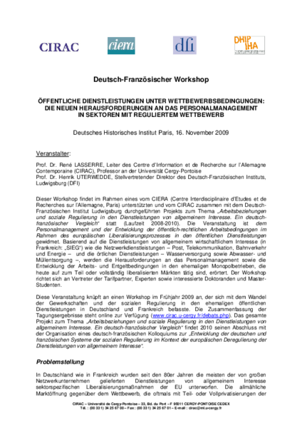 Die neuen Herausforderungen an das Personalmanagement in Sektoren mit reguliertem Wettbewerb Workshop des CIRAC (R. Lasserre) und des DFI (H.Uterwedde) mit Unterstützung des CIERA und des DHIP