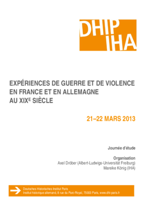 Journée d'étude franco-allemande organisée par l’IHA (M. König) et l’université de Fribourg i. B. (A. Dröber). La manifestation qui comprend une conférence dans le cadre d’un »Jeudi de l’actualité historiographique« et la journée d’étude au lendemain, a pour sujet les expériences de guerre et de violence au XIXe siècle en France et en Allemagne. Il s’agit d’initier un échange scientifique sur les effets politiques et sociales des conflits de cette époque, à savoir les guerres de révolution, napoléoniennes, la campagne française en Espagne pendant la Restauration, la révolution de 1848 et la guerre franco-allemande de 1870/71.